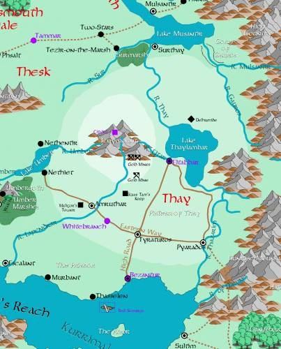 ним и от них все более часто, созывая секретные советы, и собираются создавать новые, более крупные укрепления. Военный резерв Тэя (тысячи гноллов, темных тварей и других падших существ) расквартирован в Горе Тэй, и в горе, как известно, есть два богатых золотых рудника, которые финансировали Красных Волшебников в течение многих лет, и выработанные шахты, спускающиеся в Подземье. Гора Тэй - место древней Цитадели, в которой, по слухам, все еще бушует безудержная магия. Секретные силы магически искривленного народа и монстров появились из мрачных крепостей Горы Тэй и вышли в Фаэрун на зловещие миссии. В магических цехах и арсеналах Тэя в этом регионе под командованием старших также работали сотни и сотни более молодых Красных Волшебников.
