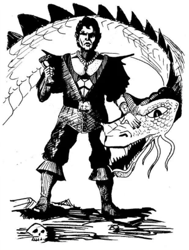 ASTAROTH: This arch-devil is the Treasurer of Hell. He used to be third in the hierarchy behind Beelzebub and Adramelech, but now he acts rather independently of the current regime. Nominally he is still third, behind Asmodeus and Baalzebul, although neither of them would try to pull rank on Astaroth except in a dire emergency. Likewise he never orders other devils around, but sometimes he will exchange favors if he wants something done. He appears as an awesome man-like being who stands 8' in height. He looks somewhat overweight and richly dressed,reeking with filthylucre. He is also reeking with aburning stench which will cause l-6 points of fire damage to all creatures within 30', although a ring of fire resistance or its equivalent will protect a being against this. Still, one must make a saving throw versus poison within 10' or lose consciousness from the smell for 2-12 turns unless one can get a Neutralize Poison within one turn. (Losing consciousness in the presence of an arch-devil is not a very bright thing to do, if one can avoid it.) Astaroth usually rides a huge ancient red dragon, and he carries a large pit viper (giant poisonous snake) wrapped around his right arm. He can also strike with his left arm for 1-8 points of damage because, like most devils, he is left-handed.