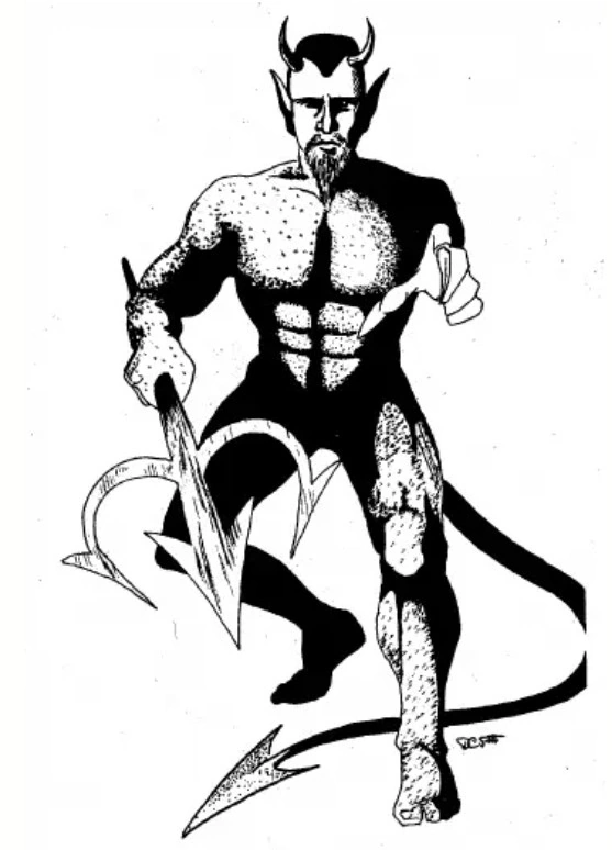 SATAN("The Prince of Darkness,""The Adversary,""Lucifer, "The Prince of Light"): First among devils, Satan is a being feared by all. He can appear in any form he wishes, but the form he prefers is that of a normal man, having features which are most likely to engender trust and respect from the person he is dealing with. In places where he is master (which are rare these days, although becoming more common), he will appear in roughly humanoid form, about 7' tall, with horns, tail and pitchfork and having a deep red skin color, almost maroon, with a majestic countenance. He can move as fast as he wants to, and he can accurately teleport, cross dimensions or even travel through time if need be. In order to strike Satan with a weapon, the attacker would need a +3 weapon to hit him, and he would also have to have a clear con- science and an absolute determination to pursue one's objective, which of course must be of the purest motives. Anyone who dares attack Satan psionically will automatically fall into his control forever (a Wish can recover an individual, but nothing less will do). Of course, Satan cannot be affected by a psionic attack, but he will not use normal psionic attack modes.Satan may use any spell or psionic discipline as often as he likes.He casts spells as if he was a 3Oth level caster, except for druidic spells, which he casts as a l4th level caster. He uses psionic disciplines as if he had them at the 3Oth level of mastery with a psionic ability of 500, although he does not actually use any points doing so. Satan also has the ability to alter fate, in order to cause a number of unfortunate events to happen to an individual, such as the death of friends and family and thé ruin of business, career, property, social status, reputa- tion and health, to start with. Fortunately, however, for the victim, if he remains resolute in the face of this suffering, the forces of good will eventually relieve his problems in order to maintain the Balance of the Multiverse, although the victim may not receive any compensation for the trouble he has gone through.