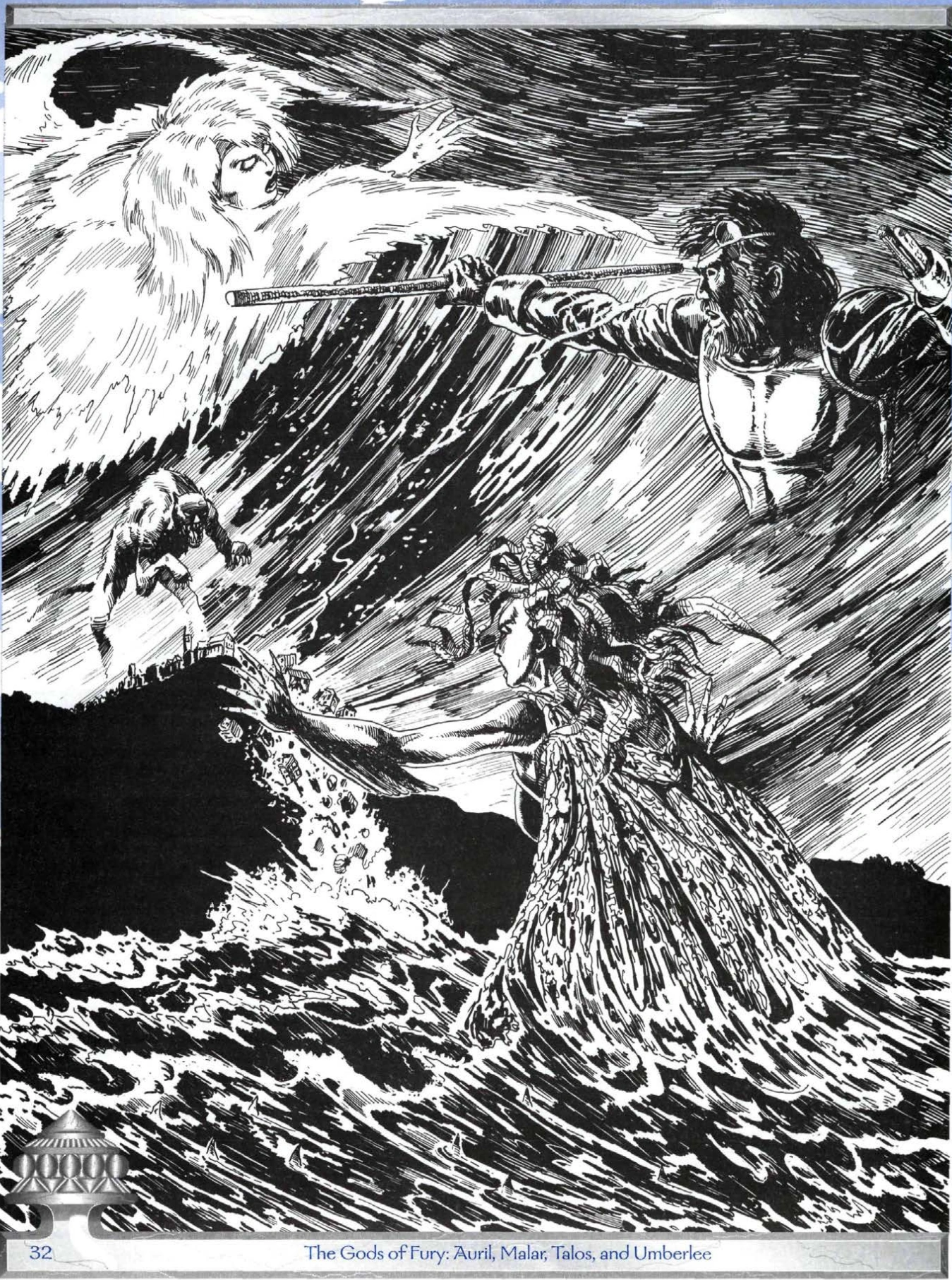 When Talos is portrayed in religious art, he looks similar to his avatar (see below). His home, the Towers of Ruin, is also known as the Screaming Towers and the Towers at the Heart of the Winds because of the howling winds that curl eternally around it in a helix. He is served by Auril, Malar, and Umberlee. Collectively, the four are known as the Gods of Fury. The storm god's relationship with Auril is said to be close and cordial, though he has no compunction about attempting to erode and usurp her portfolio and power base whenever possible. His relationship with Umberlee is flirtatious and filled with rivalry. Talos and Malar only grudgingly work together, and Malar would happily kill Talos if he only had the power to do so. Talos has recently sponsored the once-mortal Velsharoon the Vaunted to demipower status, but Velsharoon is not likely to survive long with the sort of "aid" Talos seems to be providing powers in his service.