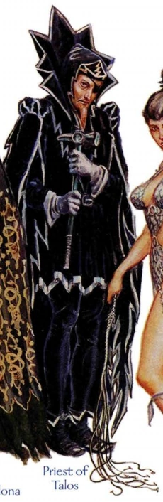 High clergy of Talos have ceremonial robes of blue-white streaked with crimson that seem to crackle with lightning due to a minor illusory glamer, but all clergy dress in robes and cloaks of black shot through with teardrops and jagged lines of gold or silver—garb which has earned them the unflattering name "doom crows," as they go about the Realms preaching of devastations to come. The robes have jagged hems and rough, uneven sleeves. A black eyepatch is also worn, even if the clergy member has good vision in both eyes.