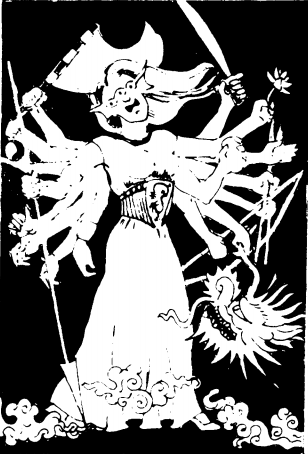Tau Mu appears on the earth with 16 massive arms, 3 eyes in her barely human head, and red scaly skin. She uses many weapons in battle: a magical bow that never misses anything within 100 yards, the arrows of which do 1-10 points of damage per strike; a + 3 spear that hits for 3-30 points per strike; a +3 dancing sword; a large red flag that projects 3 death spells from its folds every melee round; a living red dragon's head that breathes fire as a normal dragon with 8O hit points; a piece of the moon that is able to block any single hit directed at her person in any given melee round; and a lotus flower that heals all wounds at a touch. Her free claws do 1-10 points of damage per hit. She may make up to 8 attacks per melee round.