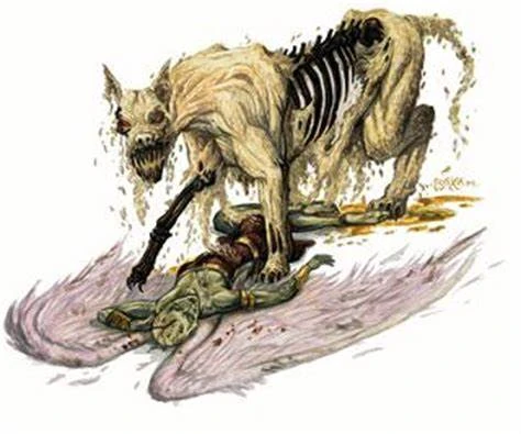 Kezef the Chaos Hound is one of the elder, eternal evils of the Outer Planes created in the dawn of Abeir-Toril's prehistory. The ravager of the heavens appears as a huge mastiff with unearthly, malevolent, red eyes and a ratty tail. His fur teems with maggots, the coat shifting incessantly over barely covered sinews and bones. His flesh oozes like pus from an old sore and his paws leave burning prints in the ground that spread into pools of burning ichor in his wake. His pointed teeth glitter like daggers of jet in the light. His blood is a dark, liquid ooze that burns on the touch, and he radiates a pestilent aura of decay. The fetid air of his breath extinguishes all nearby fires, and he reeks with the sweet stench of ancient death that can be detected from many miles away. Kezef can speak any language in a low and rumbling growl.