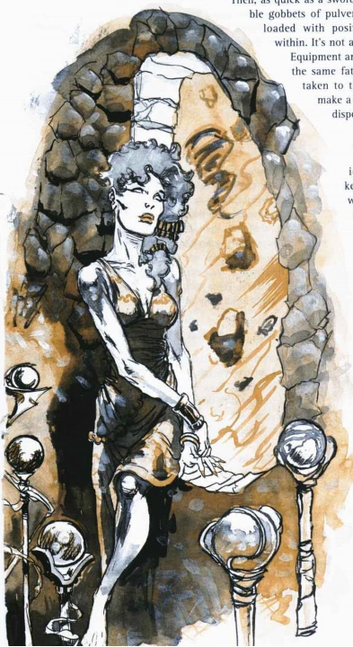 Combat can be really interesting here. First off, the plane heals all wounds- -some folks say it's time that does that, but I know it's positive energy (that's a joke, berk). Anyhow, it's true that a body that gets nicked finds himself flooded with positive energy and suddenly he's as good as new. Now, if a blood's got himself protected from the normal energy surge of the plane, he'll find himself without this particular advantage. That's why some canny basher figured out a way to lower the protection momentarily to let healing energy in when he got wounded. Here's how it's done: A protected basher makes a Dexterity ability check. If successful, that means he's quick enough to give it a try (quickness is important, because if the protection's down for more than just a moment, it's gone for good). Next, he makes a Wisdom ability check to maintain control over the protection while it's down- like making sure the dam doesn't break when the gates are temporarily opened. If both checks are successful, the sod gains 2d6 hp, doesn't lose his protection, and the whole thing takes only a single round. If the first check fails, nothing happens at all and the time's wasted. If the second check fails, the protection fails, overwhelmed by the onslaught of energy, and then the sod's subject to the full power of the plane.