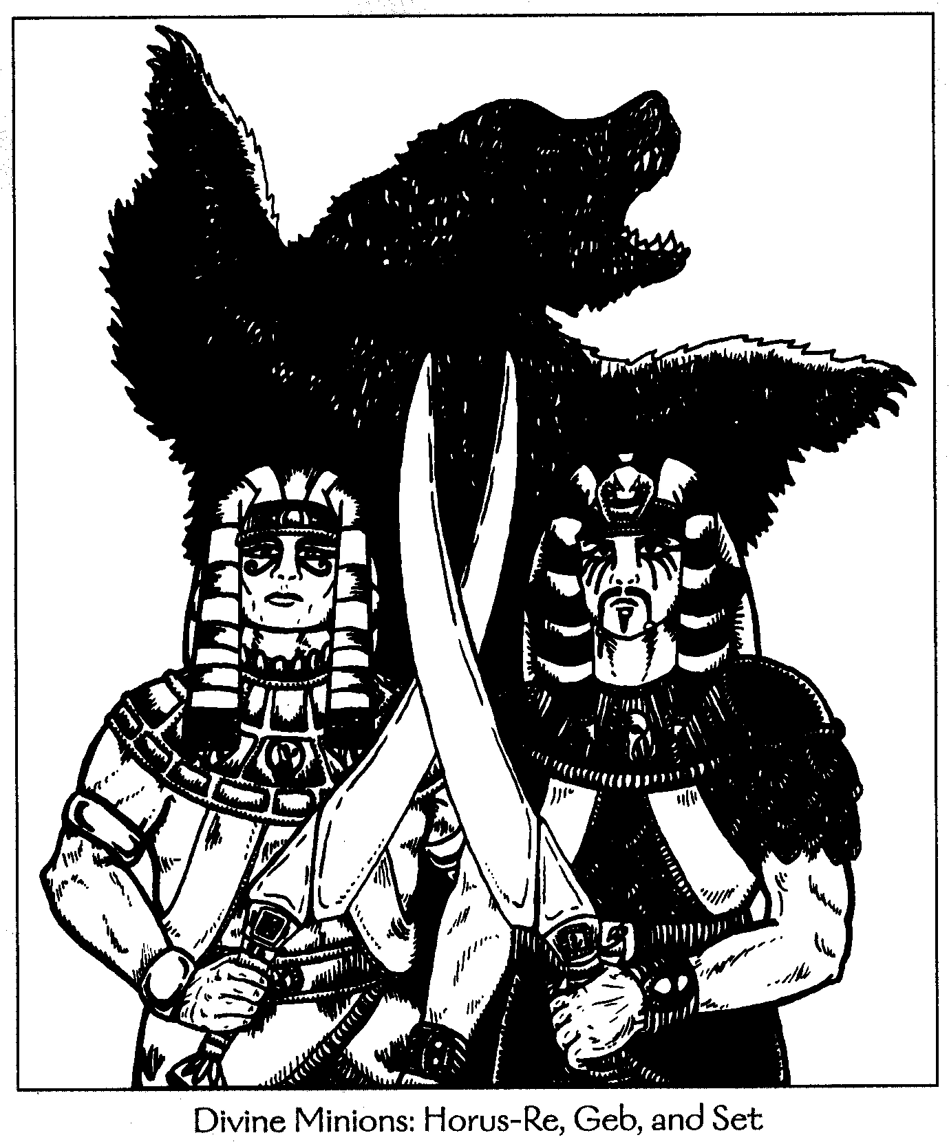 Divine minions serve as messengers of the deities. They appear as great, well-muscled male or female warriors well over 6 feet tall and dress in bronze plate armor that is decorated with the symbol of their deity. They wield huge khopeshes, scimitars, or two-handed swords. Minions of Set also serve as assassins and provide military assistance for the Lord of Evil's mortal worshipers. Minions of Set favor khopeshes or broad swords and dress in black, scaly plate mail armor.