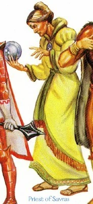 Priesdy Vestments:Divinators of Savras garb themselves in pale yellow robes with a depiction of their power's holy symbol sewn to their chest. They wear simple sandals on their feet and a colored sash of muted hue tied around their waist. All of Savras's clergy tattoo a depiction of the third eye of Savras on their brow. High-ranking and wealthy priests have clear or white crystals or gemstones of some value bonded to their brows in the centers of their tattoos.