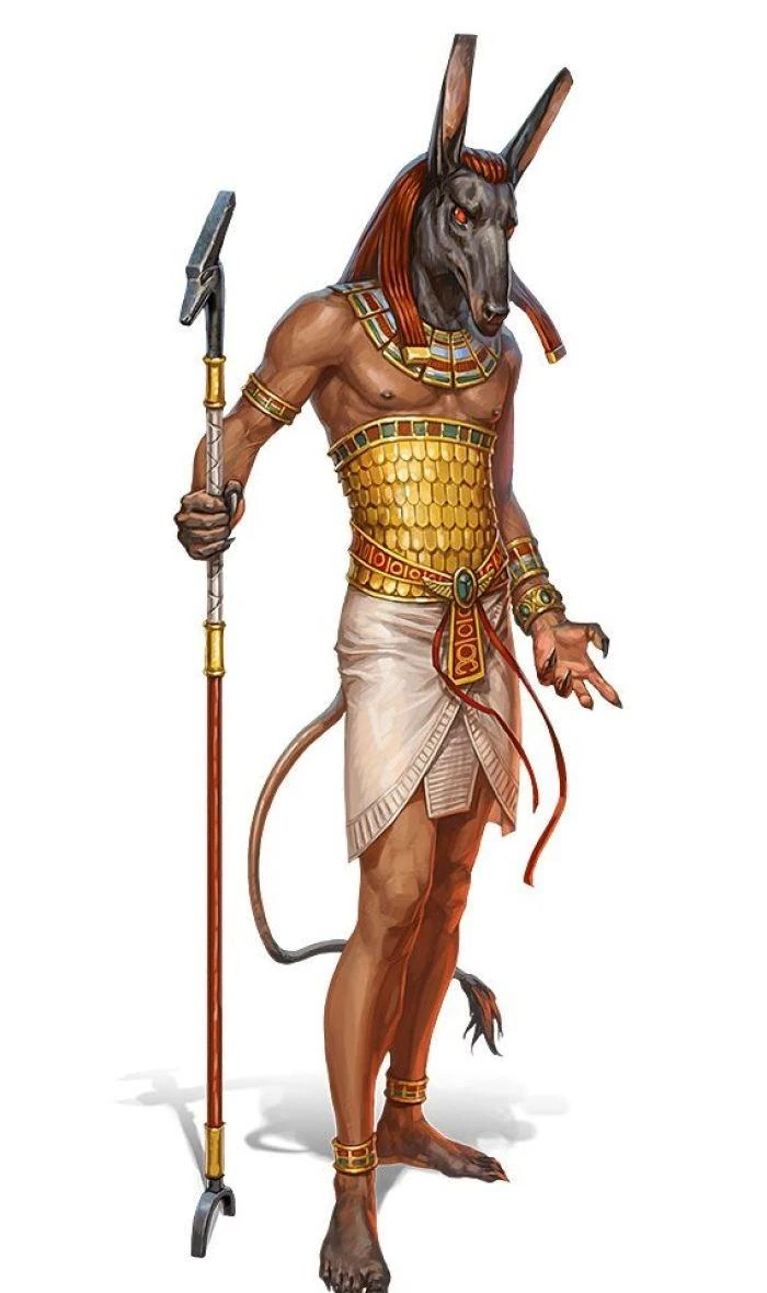 The clergy of Set dress in kalasiris (white tight-fitting linen skirts stretching from the waist to the knees), sandals laced to the knee, and a headdress adorned with the head of a snake, crocodile, scorpion, or jackal. Not unlike the clergy of Anhur, they typically wear an ornate pectoral collar that serves as a lower coif and breast plate and armlets and bracers that collectively serve as the equivalent of a vambrace. (Priests have a base AC 7 while wearing their full ceremonial garb.)