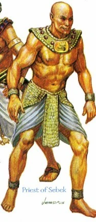 Adventuring Garb: Clergy of Sebek dress practically when adventuring, wearing comfortable shoes and a rugged kalasiris. When in human form, they often don leather or scale mail armor. (Their natural Armor Class is crocodile form is sufficient to protect them.) Clerics prefer clubs in combat, and specialty priests favor scimitars.